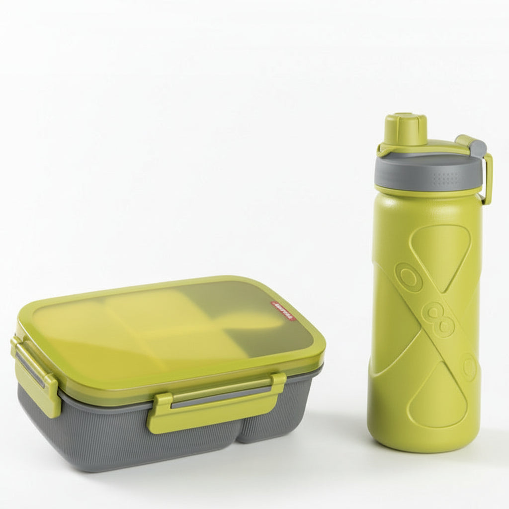 Material: Food-grade PP plastic lunch box with silicone sealing gaskets; BPA-free Tritan bottle with secure screw-top lid